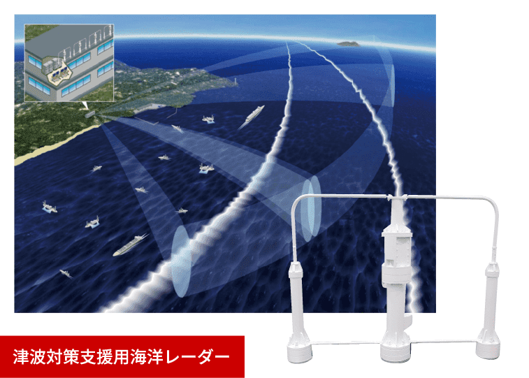 津波対策支援用海洋レーダーは、海面に沿って低周波の電波を発信することで、地平線からさらに遠くの目視できない地点の津波も正確に把握することができます。津波到来の視認性向上のため、測定した流速から潮汐や風浪等の通常の流速成分を差し引くことによる津波成分抽出に取り組んでおり、これにより早期に津波を観測し、沿岸地域の防災・減災に貢献します。