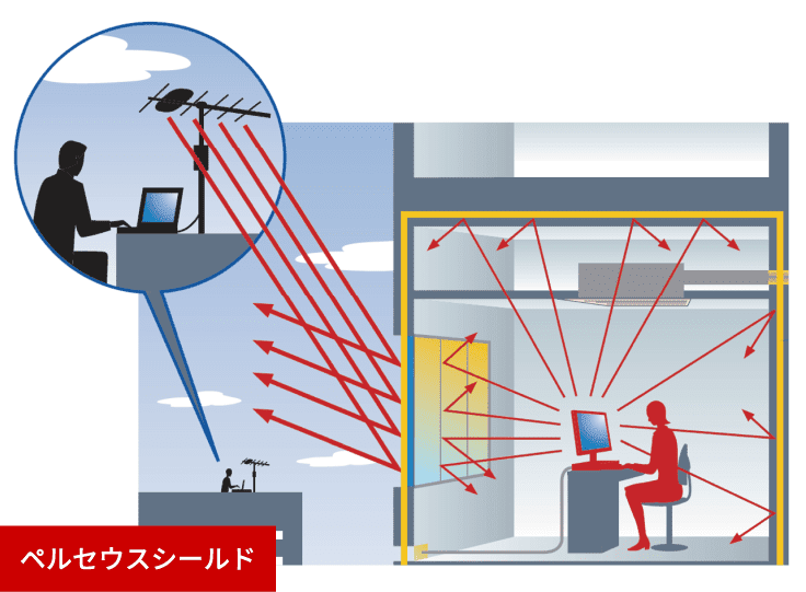 現代の情報社会の脅威となりうる電磁サイバーテロから重要な情報を防護するペルセウスシールド。建物を構成する床/壁/天井/窓/扉/電力線/通信ケーブルからエアコン設備に至るまで特殊なシールド層を隙間なく施工して電磁波を遮蔽することで、漏洩電磁波による情報傍受、盗聴などの不安を一掃します。また、電磁波照射による情報破壊から内部の電子機器を保護しており、電磁的にシールド性能を有するオフィス環境を実現しています。