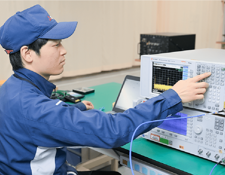 私は主に防衛省向けの航空機に搭載する衛星通信装置の品質管理を担当しています。この装置を介せば、パイロットが海上を飛行している間も、地上と映像や音声をやり取りできるようになります。主な仕事は製品の検査、出荷対応、現地試験・対応などですが、設計段階の不具合を防ぐために、試験手順書や製造図面の事前確認も行います。重量や大きさは設計通りか、音声や映像に問題はないか、お客様は使いやすいかなど、多角的な視点から注意深く検査し、製品不良を防ぎます。