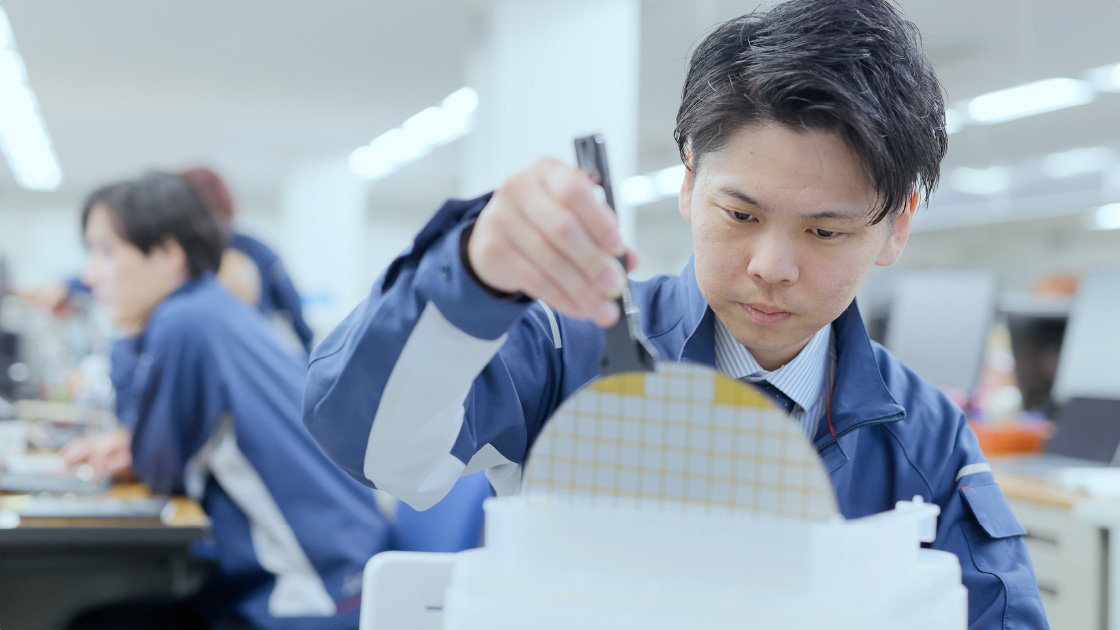 あらゆる分野に不可欠なキーデバイスとして需要が増加しているパワーデバイス。ここでは、そんなパワーデバイスのウエハ製造を行うパワーデバイス製作所で、標準時間管理や作業改善提案を担う山﨑の1日を紹介します。
