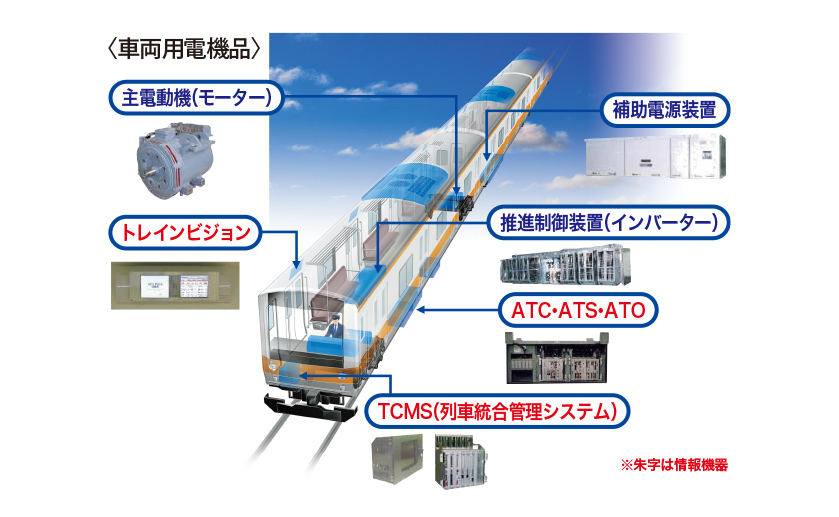 交通システム・エンジニアリング(車両システム、交通情報通信システム)及び鉄道車両用電機品(主電動機、制御装置、電源装置、空調装置、ブレーキ電機品、車上情報装置、車上保安装置ほか)、地上システム(信号システム・車両電機品用試験装置、非常用発電機・ホームドア)