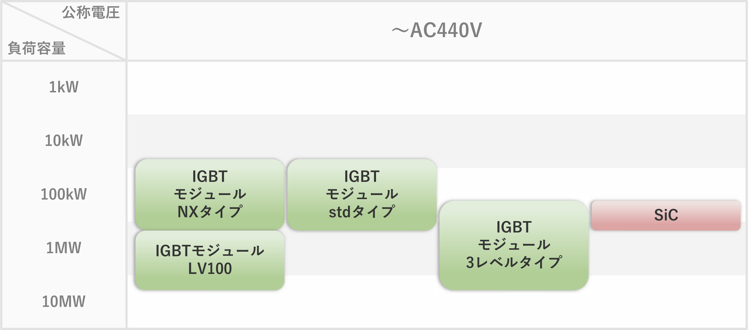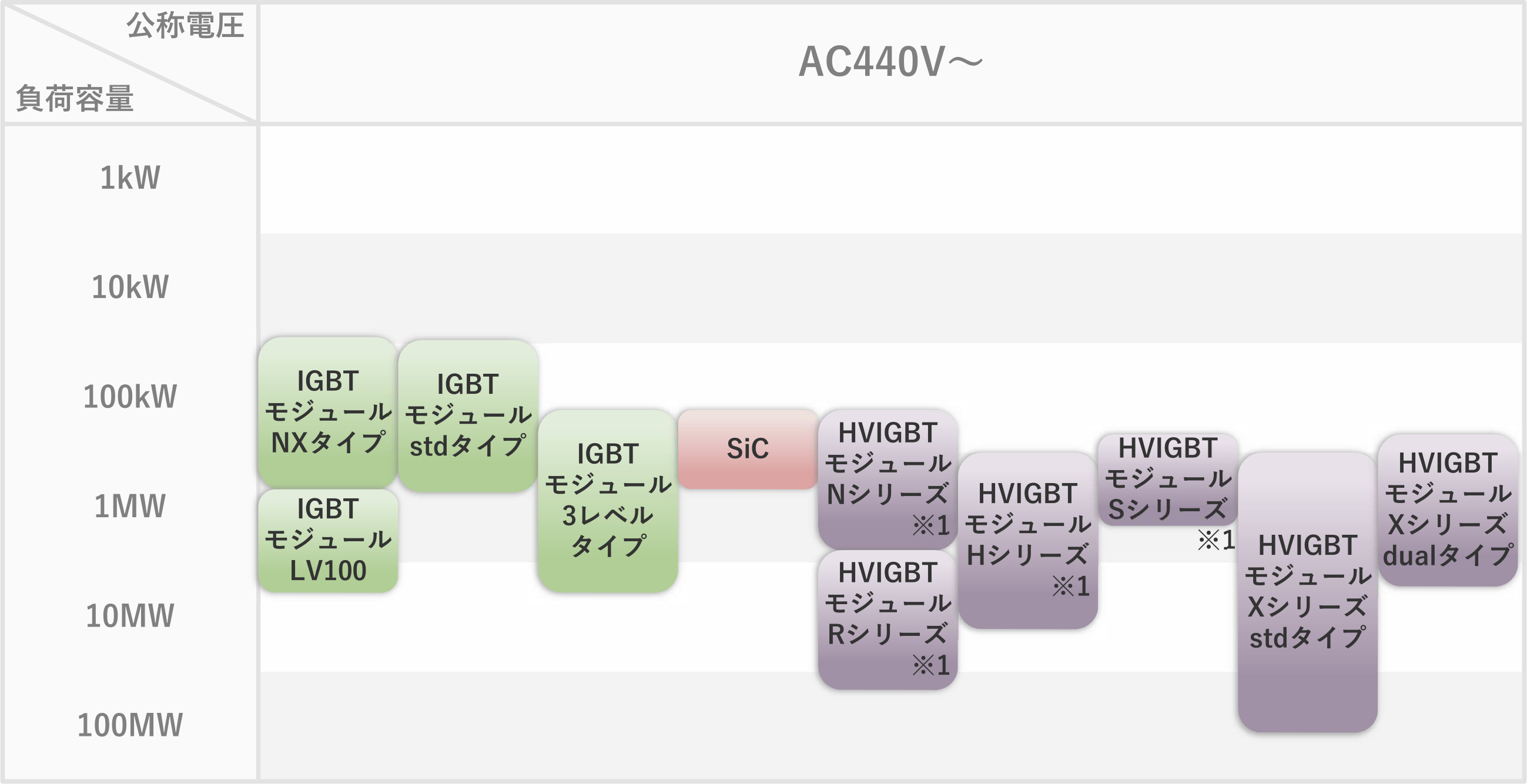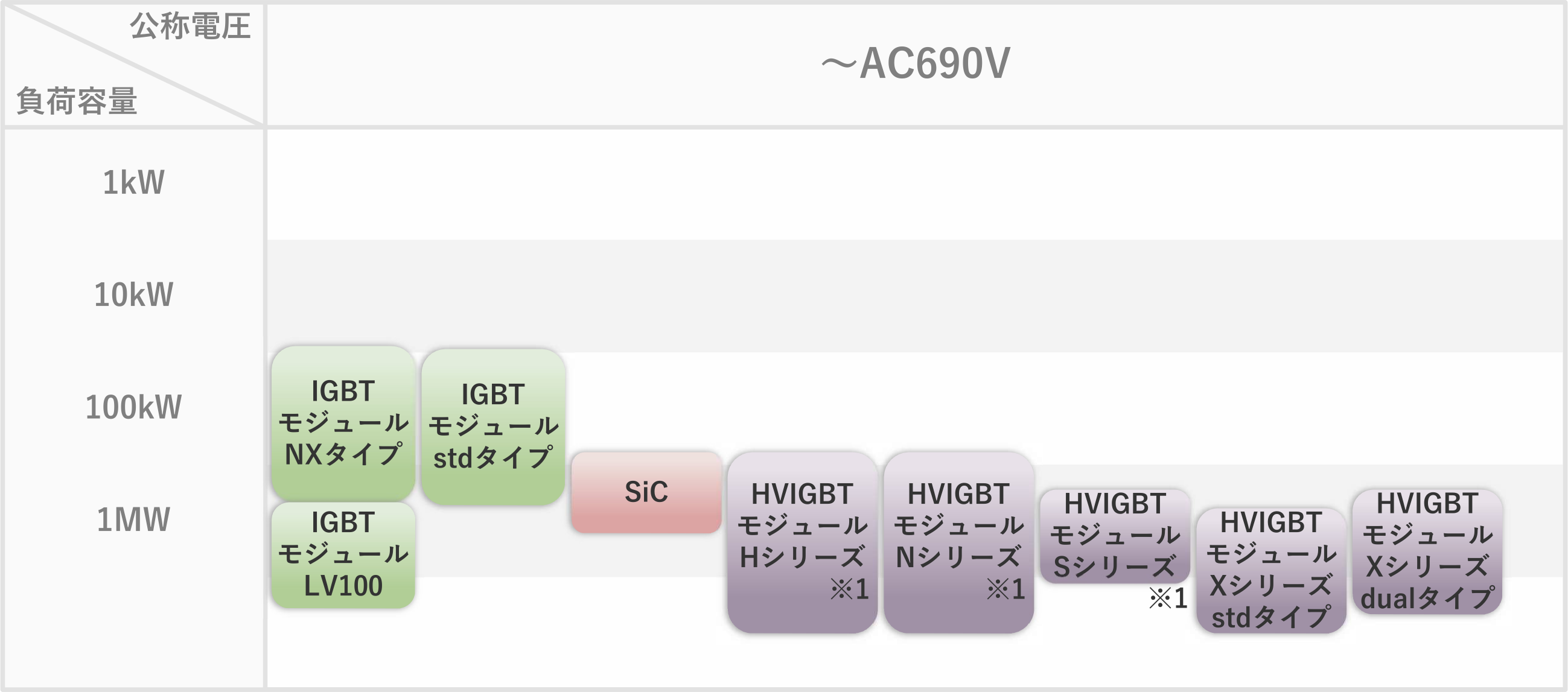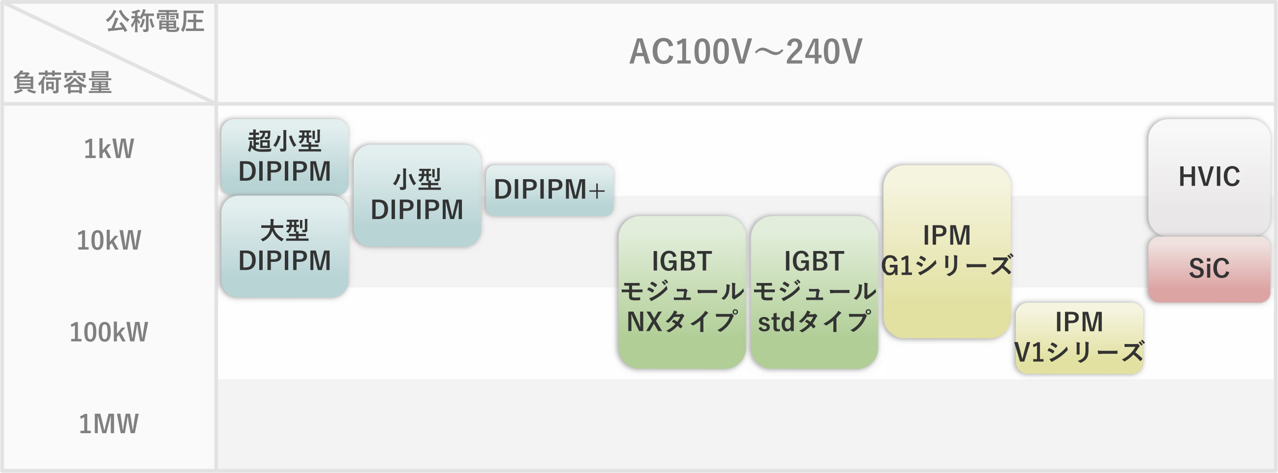 注)HVIC:高耐圧MOSFET/IGBT用ゲートドライバーIC HVICを用いた機器の電流範囲を示しています。 |
