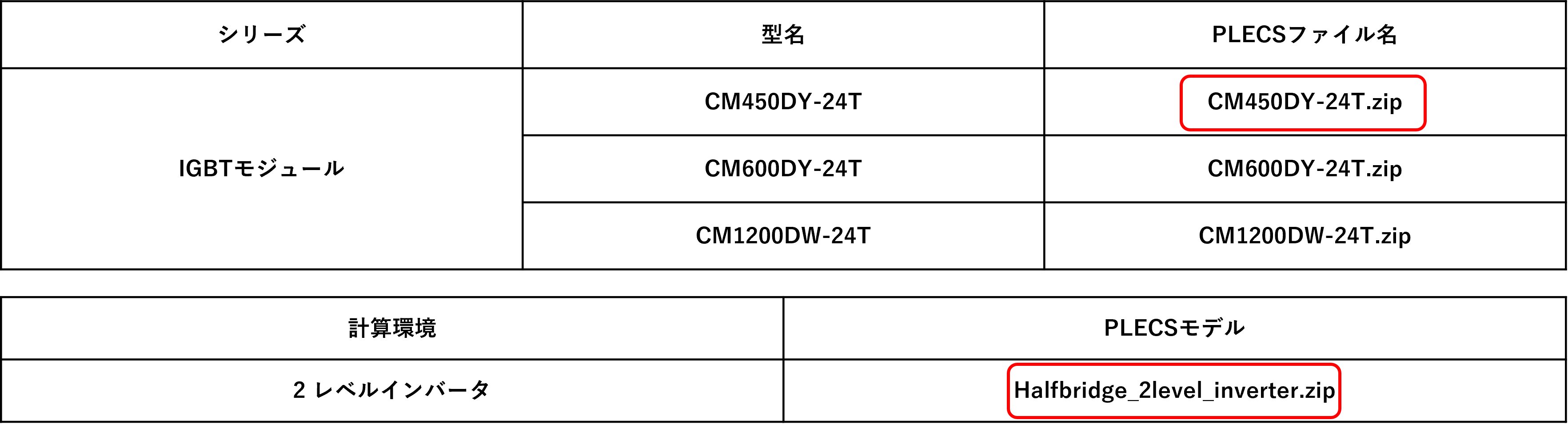・下表1にパワーデバイスの型名に対応したPLECSモデルのzipファイルが掲載されています。