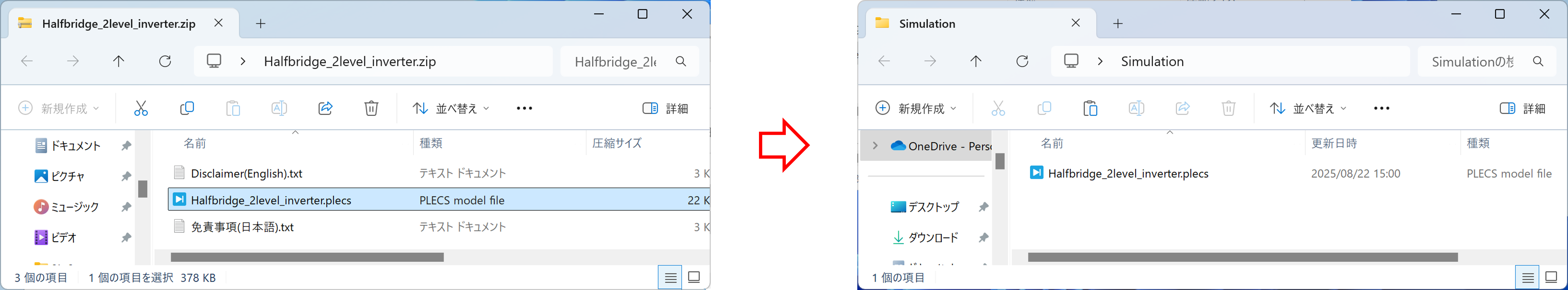 ・"Halfbridge_2level_inverter.zip"の"Halfbridge_2level_inverter.plecs"を適切なフォルダを作成し、配置します。