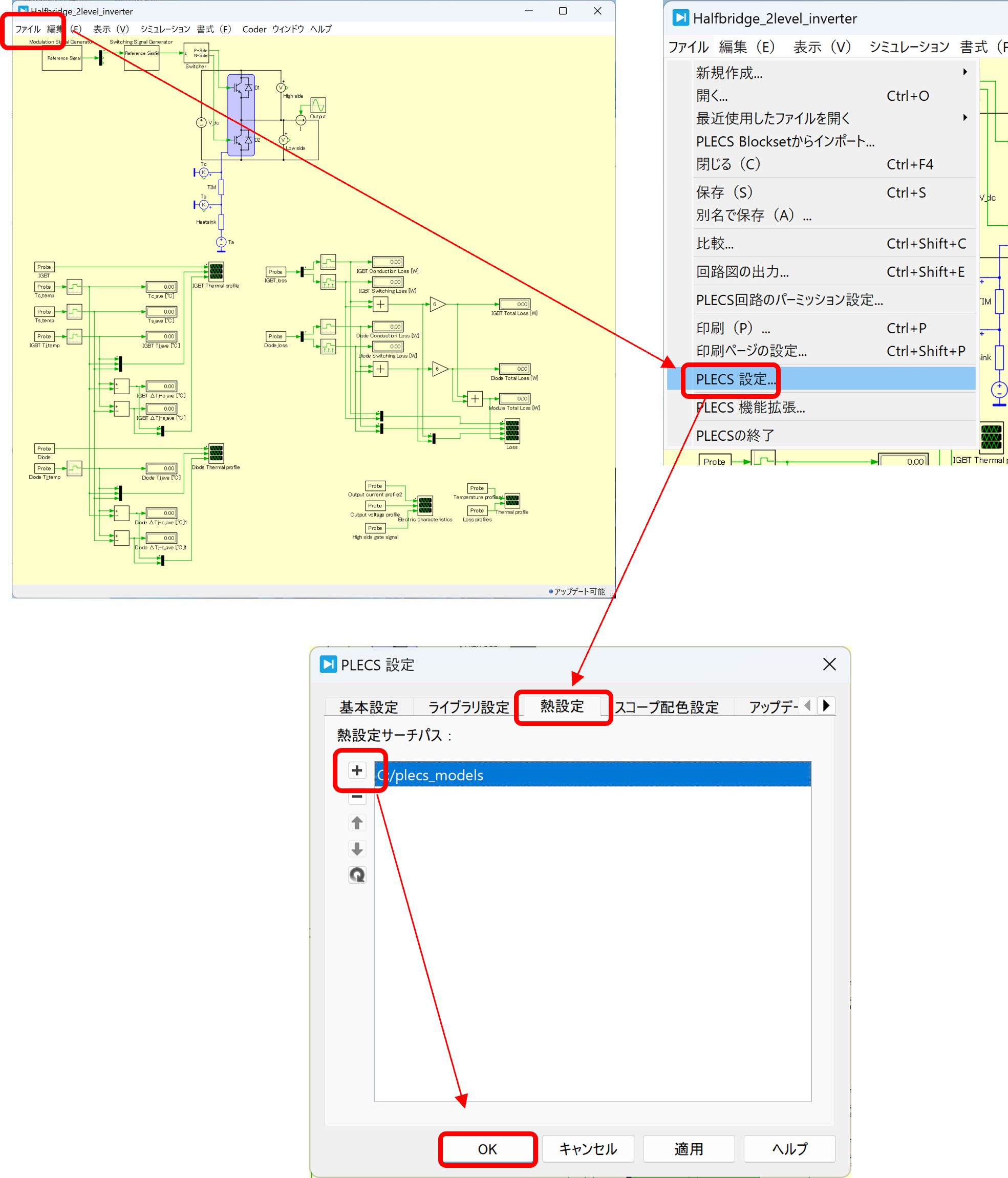 ・下図2に示しますようにタブの"ファイル" → "PLECS 設定" → "熱設定"の順に表示し、