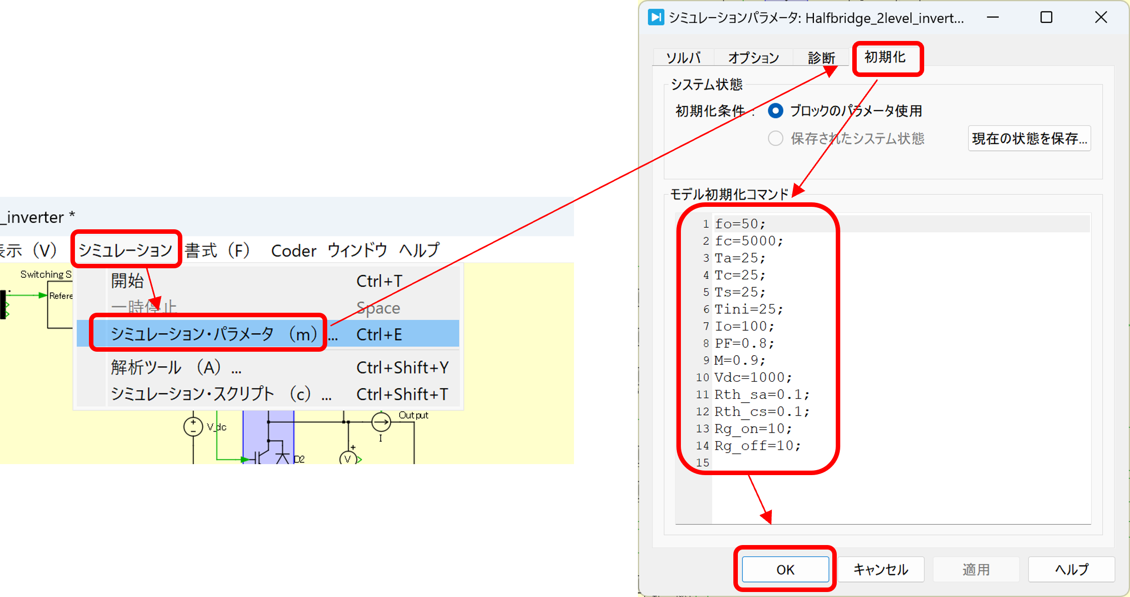 ・図4に示しますように、"シミュレーション" → "シミュレーション・パラメータ" → "初期化"にて、モデルの初期化 コマンドを下表2を参考に設定し、"OK"をクリックする。