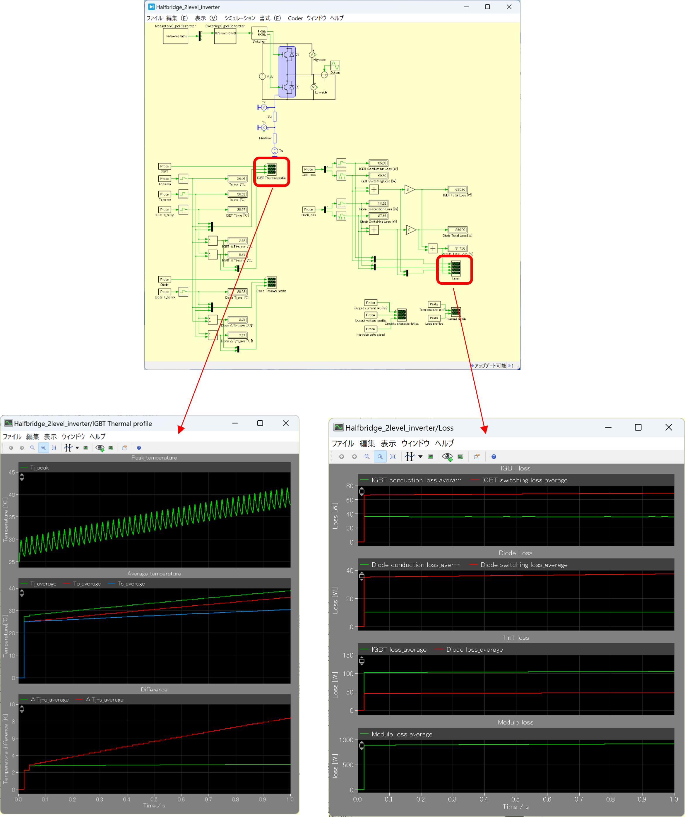 ・IGBTとDiodeの温度上昇の過渡応答や損失の時間変化を下図6のように図示することができます。
