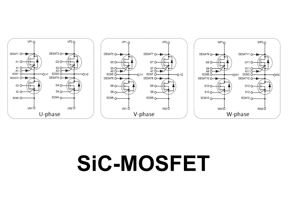 J3-T-PM※1 と ピンフィンベースプレートを接合し6in1パワーモジュールを構成しました。SiC-MOSFET を搭載し、EV や PHEV 等の航続距離延伸と電費改善に貢献します。