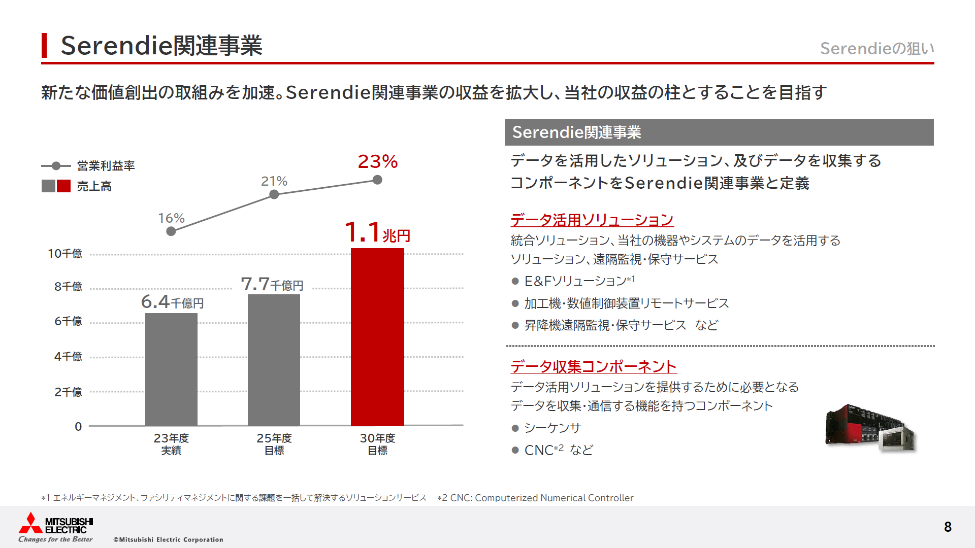 Serendieでは、コンポーネントから集めたデータを活用して顧客の課題を見つけ、解決策を提供するデータ活用ソリューション事業と、収集したデータをもとにコンポーネントを進化させる事業の2軸で展開予定。2030年度までに、1兆1,000億円、営業利益率23%の売上高を目標に定めています。