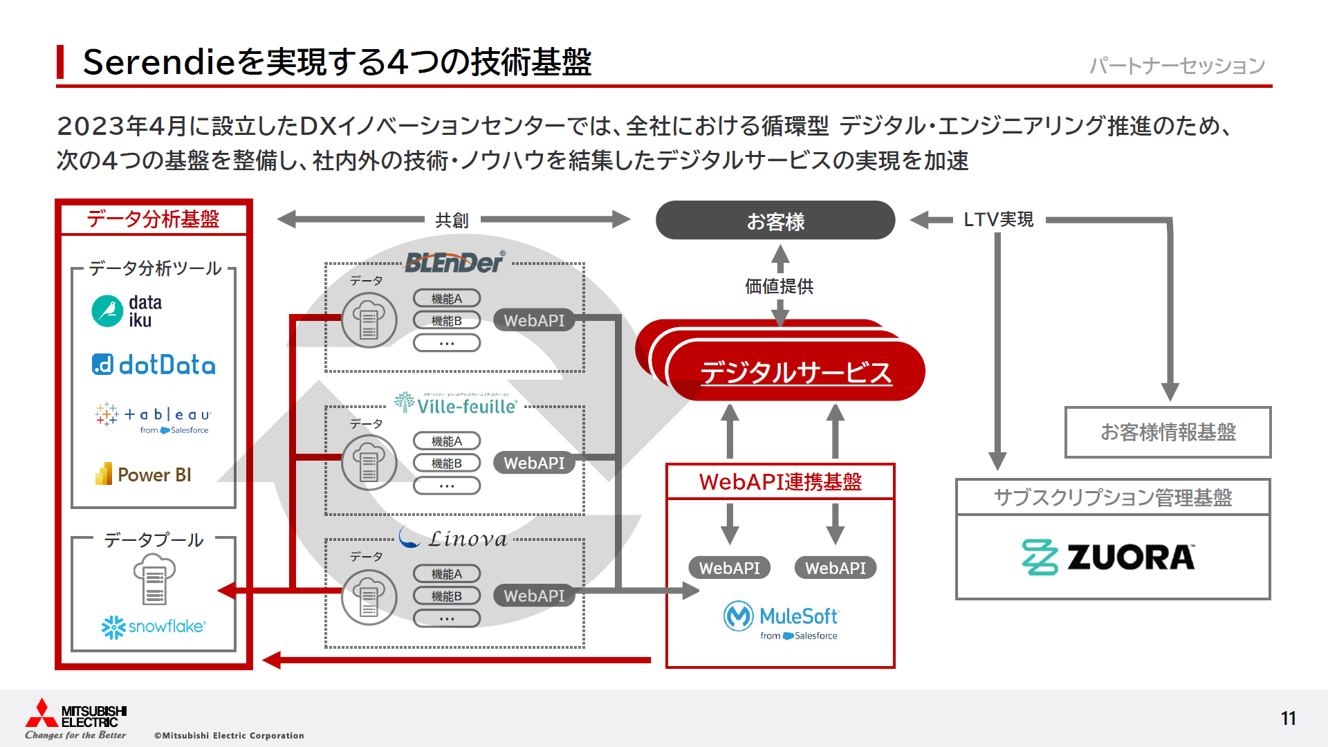 次に、Serendieを推進するためにスクラムを組むパートナー企業3社とのトークセッションを実施しました。三菱電機は、Serendieの充実・強化に向け、①データ分析基盤、②WebAPI連携基盤、③サブスクリプション管理基盤、④お客様情報基盤の4つの技術基盤を整備し、社内外の技術・ノウハウを結集したデジタルサービスの実現を目指しています。今回はそれら技術基盤で連携しているパートナー企業が登壇し、企業概要やサービスの強みなどについて説明しました。