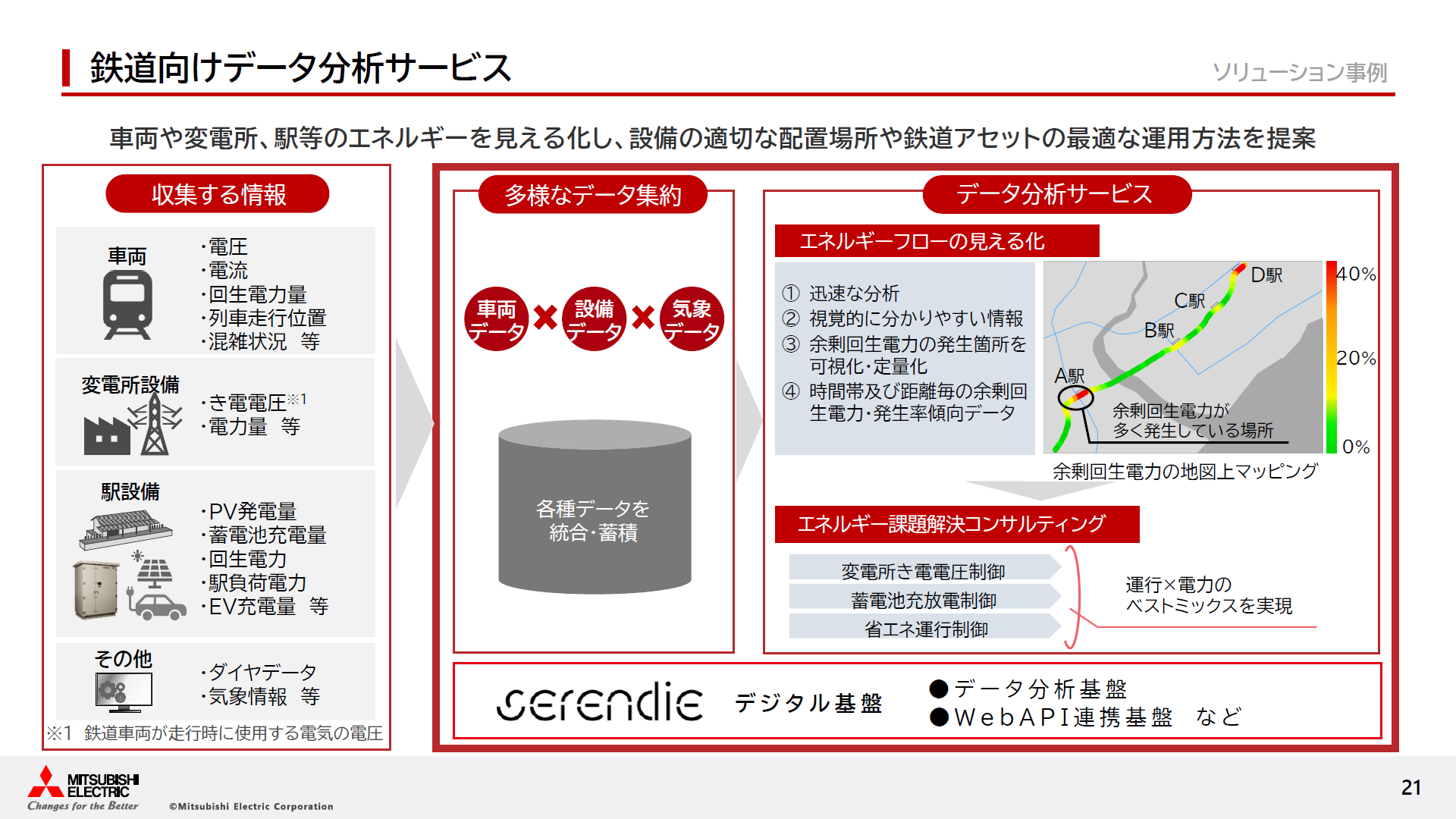 鉄道向けデータ分析サービスでは、Serendieを活用することで車両や変電所、駅の電力使用量、列車運行状況など、あらゆるデータを組み合わせて分析。そのデータをもとに、エネルギーの効率的な活用を実現しています。例えば、鉄道車両がブレーキを使用したときに発生する回生エネルギーの余剰電力を見える化し、地図上にマッピング。その情報に基づいて、駅舎補助電源装置であるS-EIV®の適切な配置場所や、駅の混雑状況、運行ダイヤ、運行状況に応じた鉄道アセットの最適な運用方法を提案できるようになりました。