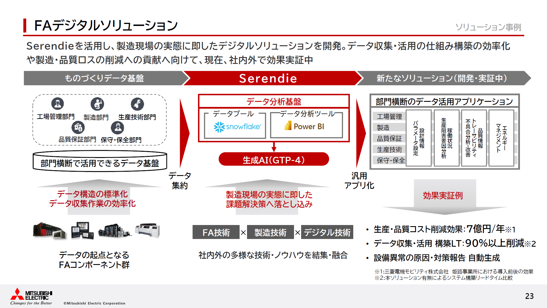 具体例として、この実証実験を行っている三菱電機モビリティ姫路事業所について紹介。Serendie活用後、生産および品質コストの削減効果が年7億円に達し、データ収集や活用、構築のためのリードタイムが90%以上削減できたと報告しました。