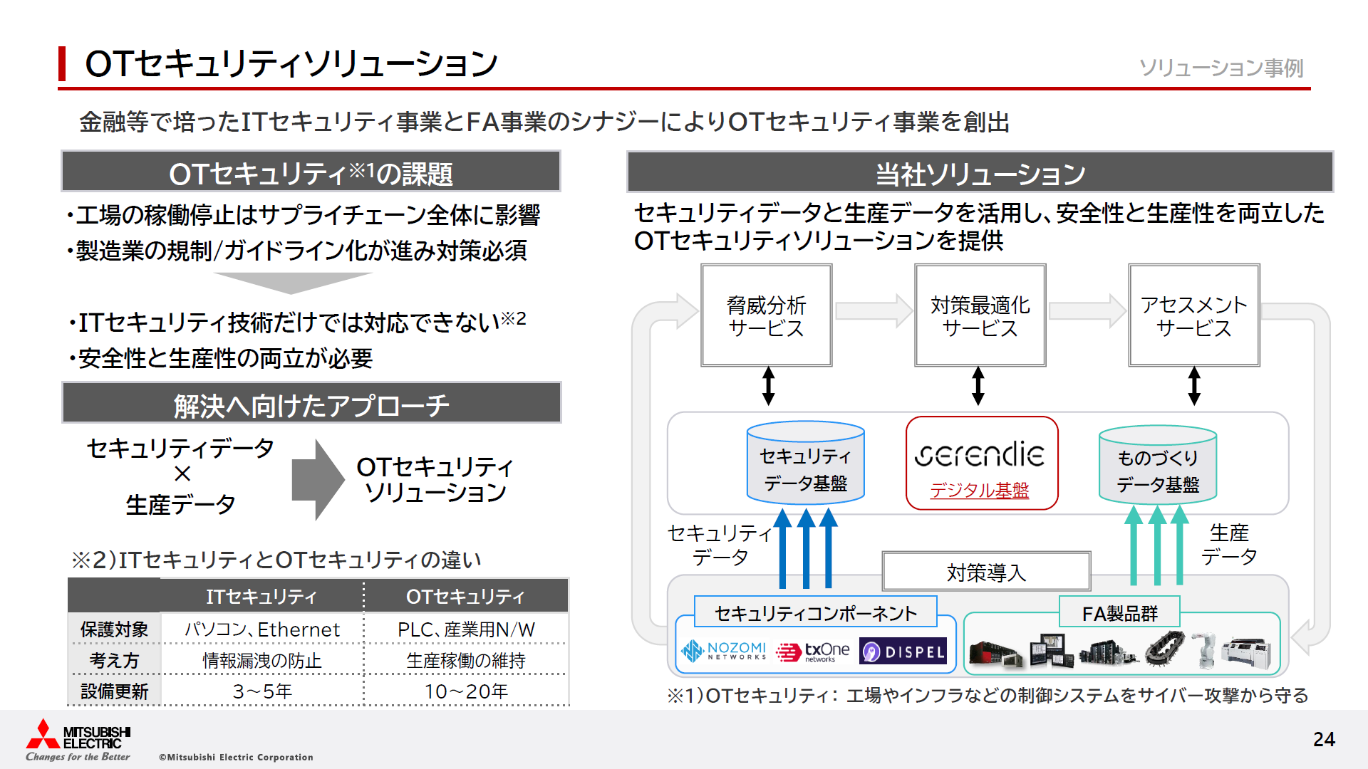 次に、OTセキュリティソリューションの事例が紹介されました。OTセキュリティ事業推進部長の柴田剛志氏は、OTセキュリティ事業について、「工場、インフラなどの制御システムをサイバー攻撃から守るための対策・取り組みを提供する」ことと紹介。サイバー攻撃は進化し続けているため、「OTセキュリティのループを回すためにSerendieを活用し、セキュリティデータと生産データを組み合わせることによって、より精度の高い、また安全性と生産性を両立したOTセキュリティソリューションを提供することが可能になります」と説明しました。