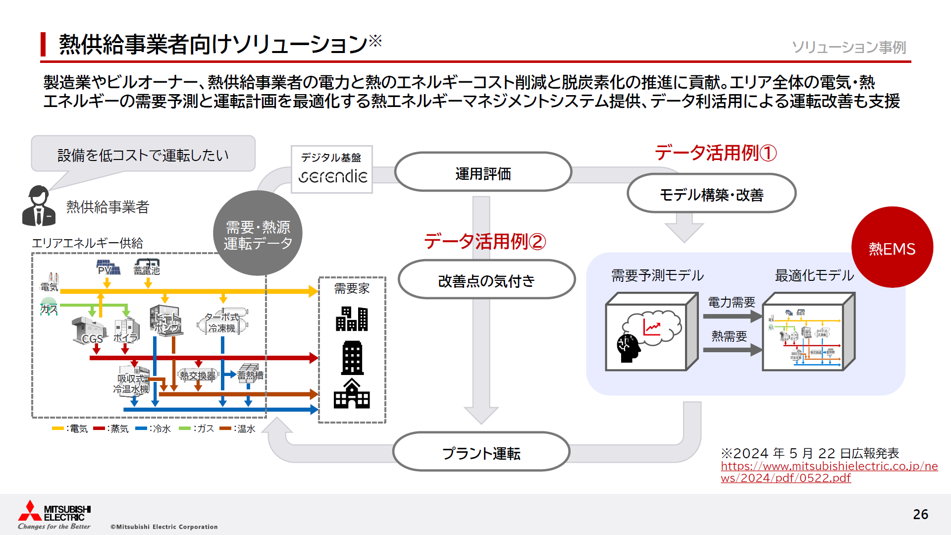 熱供給事業者向けソリューションについては、E&Fソリューション事業推進部事業企画グループマネージャーの鵜飼章弘氏がまず、「当社の熱関連トータルソリューションは、製造業、ビルオーナー、熱供給事業者様の電力と熱のエネルギーコスト削減ならびに脱炭素化の推進に貢献する取り組みで、需要、熱源運転に関するデータをSerendie上で分析・評価して、プラント運転の継続的な改善を支援することができます」と解説しました。
