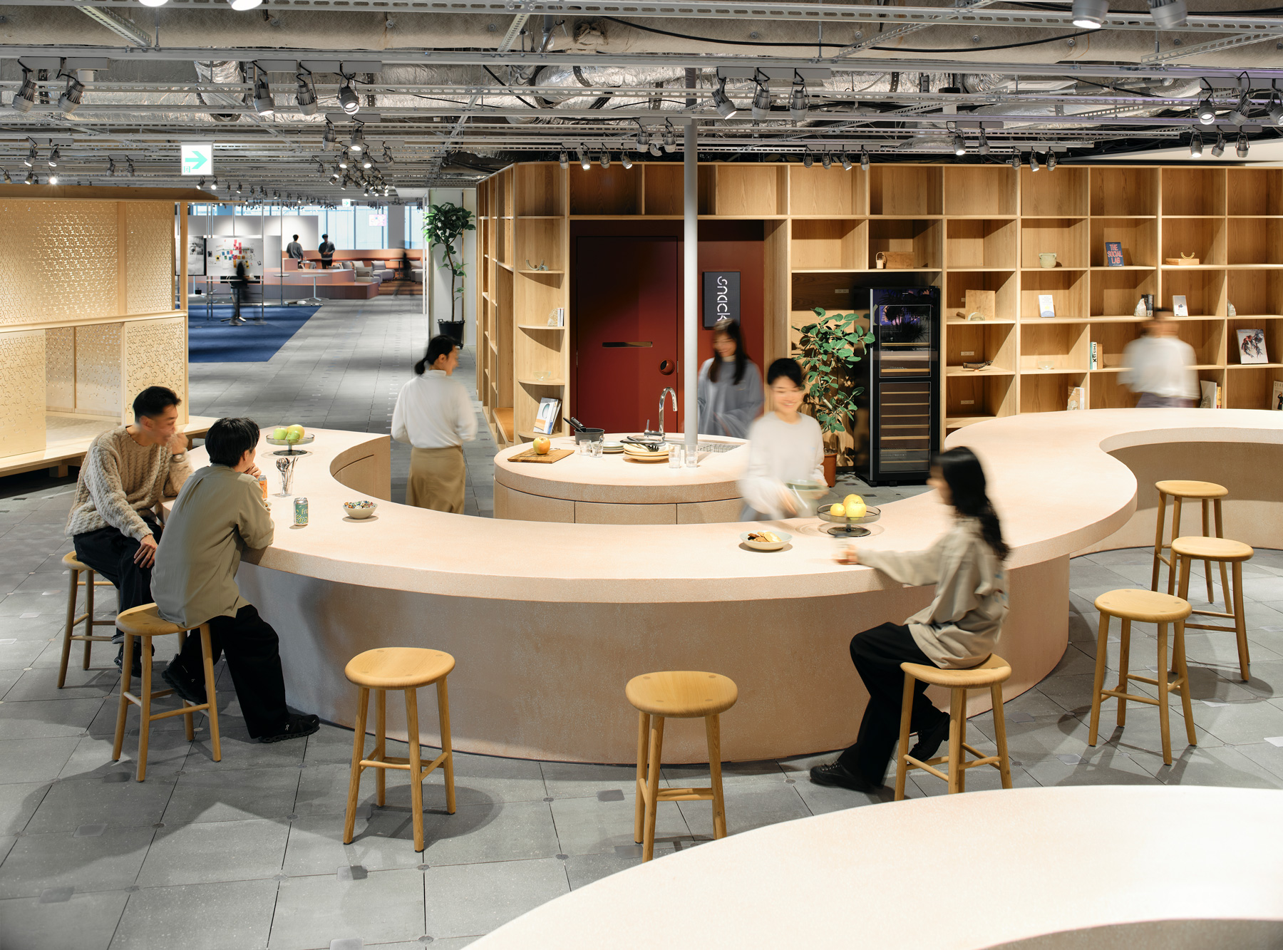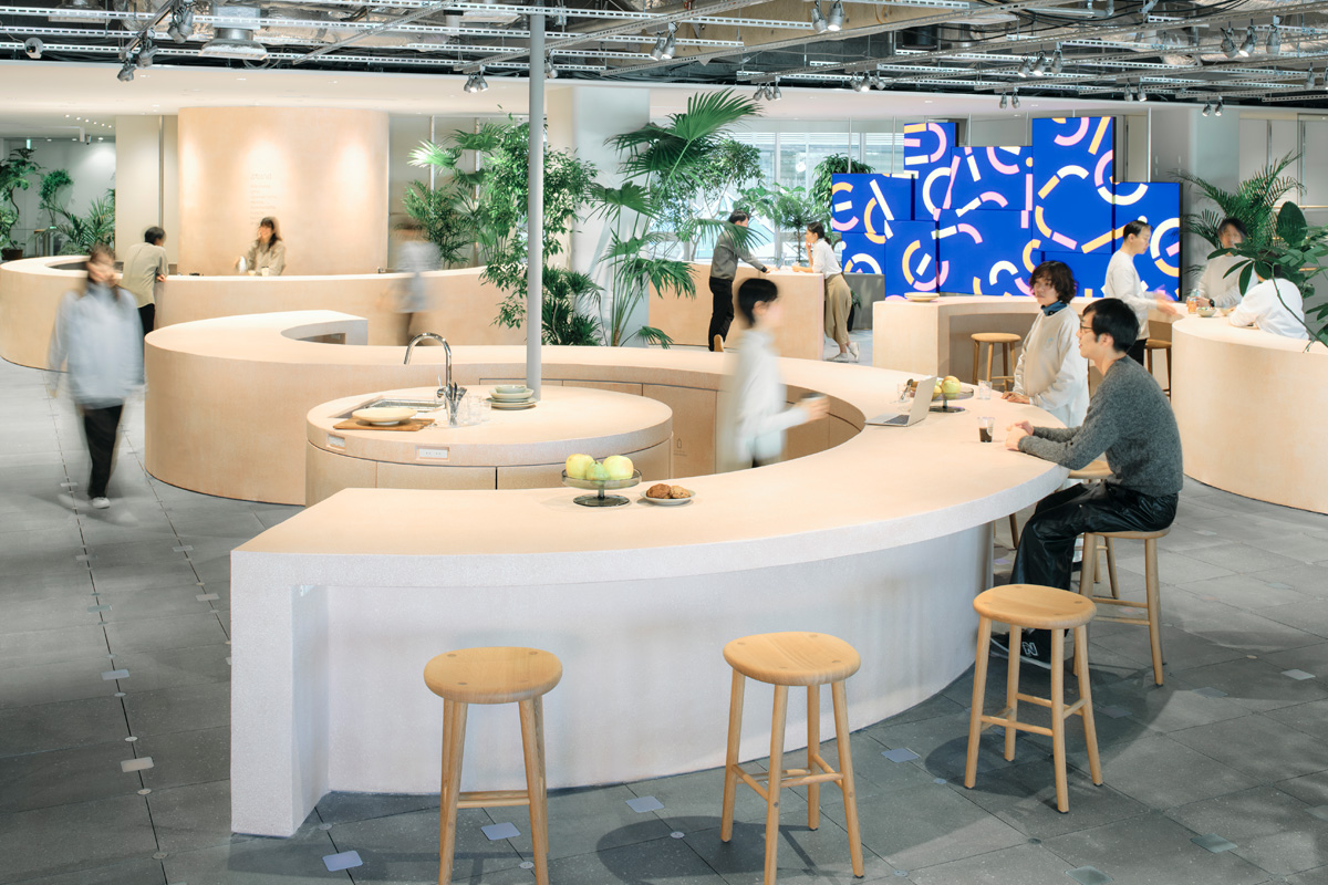 鹿野 ここはエントランス的な位置付けですが、休憩したりミーティングしたり、ちょっとした合間にも来られて、最初の交流が生まれる場として、フロアのど真ん中に持ってきました。堅苦しさを排除して円形のカフェやカウンターが並ぶエリアになっています。カウンターとしても使えるカーブ状の仕切り棚は、表も裏もなく、外と内が曖昧で、ゲストとホストではないフラットな関係性を築きやすいつくりにしました。