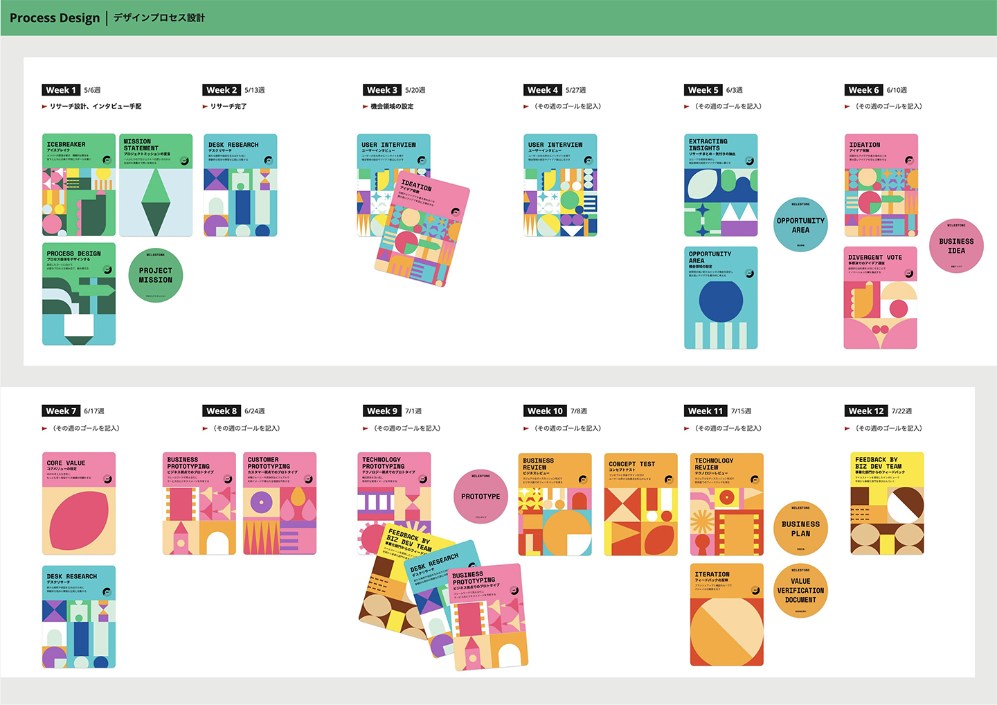 村越 「三菱電機らしいサービスデザインのプロセスを考えたい」というご要望からスタートして、まず普段Takramがクライアントとサービスデザインを行う際のプロセスを可視化しました。その上で、重視したいポイントを伺い、プロセスを修正していく中で、この形にたどり着いたんです。