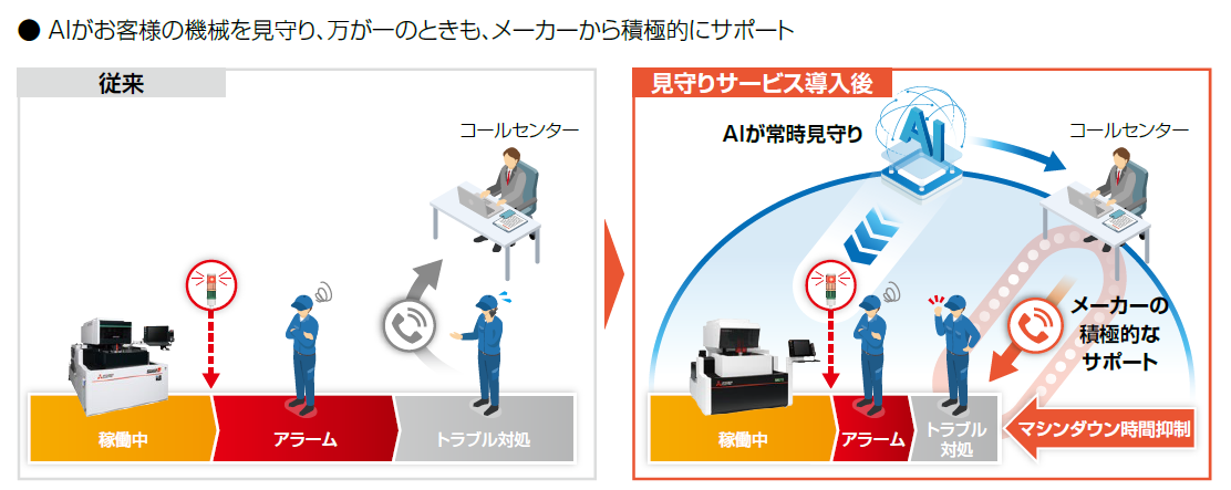 三菱電機放電加工機リモートサービスRemote4Uで検出した重大アラームを、AIにより自動解析し、対策を利用者へ通知することで、マシンのダウンタイムを最小化するサービス。