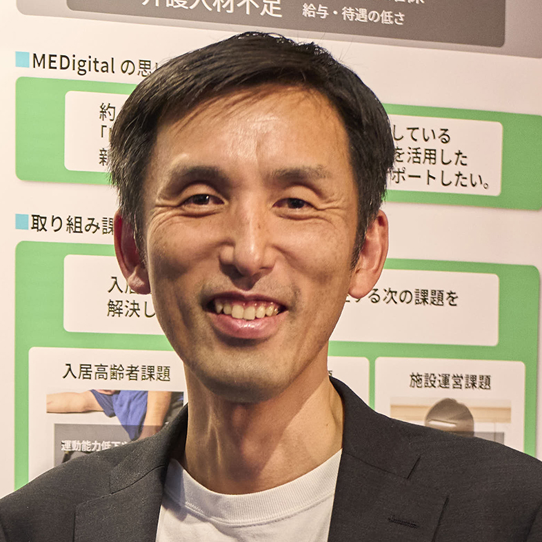 井上:私はMEDigitalで20年以上介護事業に携わってきました。さまざまな介護施設に関わる中で、「利用者の健康寿命を延ばしたい」という想いがどんどん芽生えてきました。その想いを形にするために介護施設のデータを何か生かせないかと考え、三菱電機のDICへ相談したのがきっかけです。