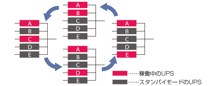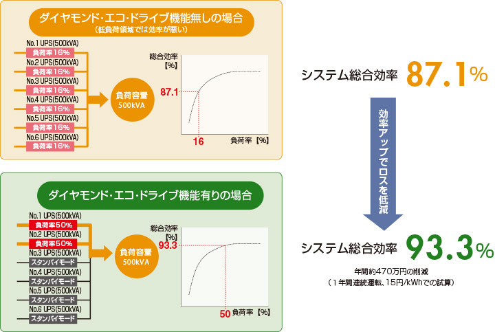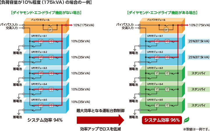 「ダイヤモンド・エコ・ドライブ®機能」とは並列運転中(3台以上)のUPSの運転モードを負荷率に応じて自動で制御することにより、低負荷領域での無駄な電力消費を節約し、システムの運転効率を向上させるMELUPS独自の省エネ機能です。