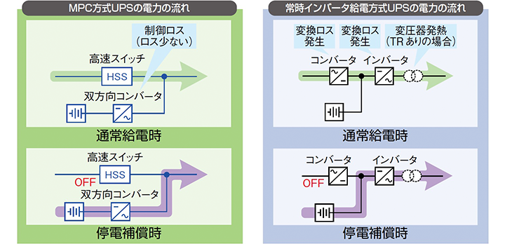 通常給電時は常時インバータ給電方式のようにコンバータ/インバータでの変換ロスやインバータTR での負荷損が発生しないため、画期的高効率化を達成しました。
