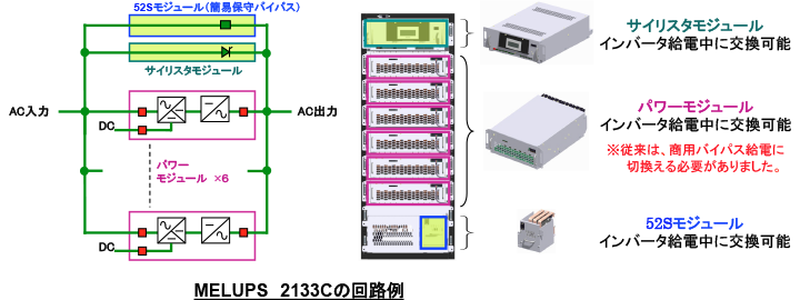 (商用バイパス給電に切換えずにパワーモジュールの故障修理可能、故障復旧時間の短縮) - サイリスタモジュールと52Sモジュールの交換も可能(新機能)です。