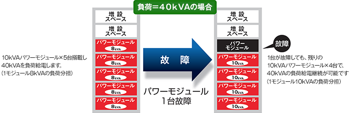 - 2011Dでは、最大15kVA(モジュール搭載数4=3+1)の冗長運転が可能。