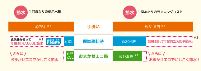 - 【標準運転時/おまかせエコ時】食器40点、小物(はし5膳、スプーン・フォーク各5点)はしは1膳=2点とする/水温約60℃、標準コース(洗い〜乾燥)で仕上げた場合。洗剤は1箱詰替え用600g入り408円(税込)(当社調べ)を5g使用。★ランニングコスト目安単価(税込)●公益社団法人全国家庭電化製品公正取引協議会「電気料金目安単価」から27円/kwh(税込)として算出。●ガス料金(都市ガス)153円/m2(税込)(当社調べ)●水道料132円/m2(税込)、下水使用料116円/m2(税込)(日本電機工業会調べ)2014年10月現在。 ※税率は8%で計算しています。