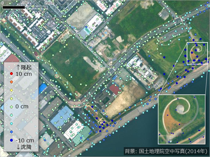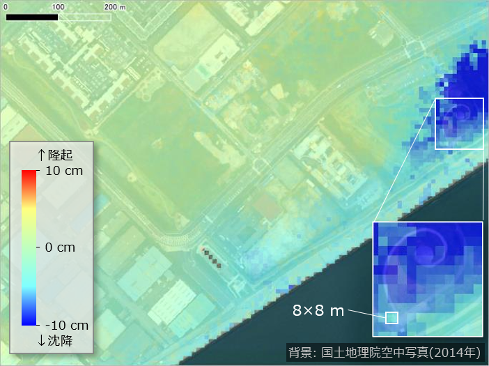 ※2 JAXA ALOS-2衛星のデータを用いて、2014年12月から2021年3月までの累積変動量を解析した事例です。隆起は衛星に近付く方向を、沈降は遠ざかる方向を意味します。