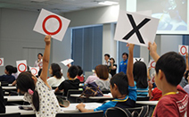 気象庁の牛田信吾さんによる「お天気○×クイズ」。全問正解すると人工衛星の模型がもらえるとあって、みんな真剣!