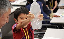 ペットボトルで雲を作る実験。お湯と線香の煙をペットボトルに入れ、ペットボトルをおしてぱっと手を離すと、雲が!