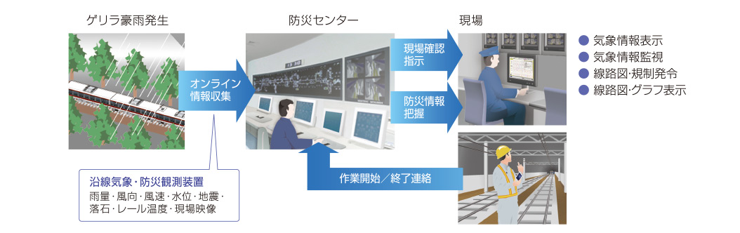 信号通信設備・風速計・雨量計など沿線に配置された各種センサーの情報を指令室でリアルタイムにチェック。