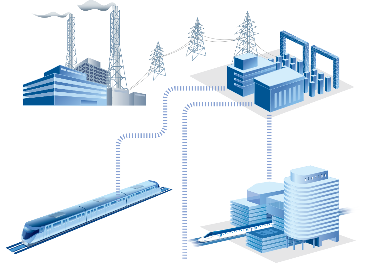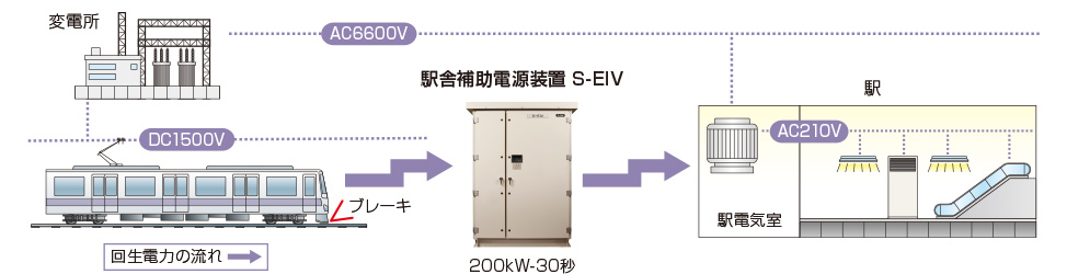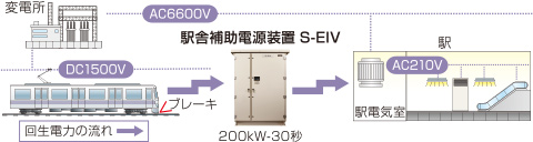 電車がブレーキをかけた時に発生する回生エネルギーの余剰分を、駅舎の電気設備へ供給します。