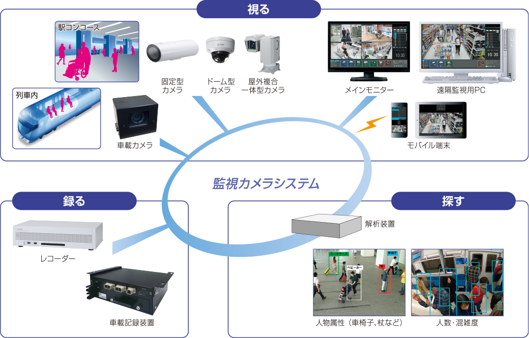 ホームや改札などの映像を駅務室や指令所などで集中監視。