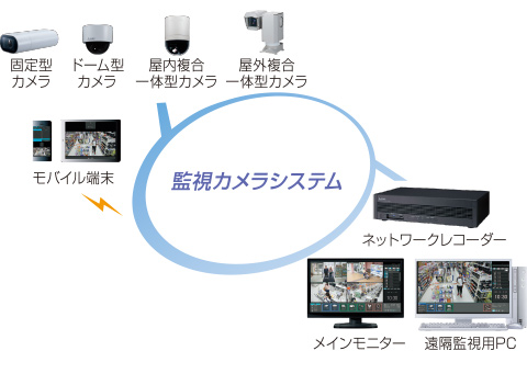 数多くのラインアップを持つカメラをはじめ、レコーダー及びネットワーク機器を組み合わせた、さまざまな用途の監視カメラシステムを提供します。