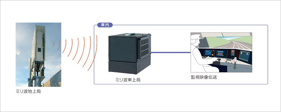 ミリ波の広帯域伝送特性を利用して、地上・車上間で映像情報などの大容量データ伝送を行います。