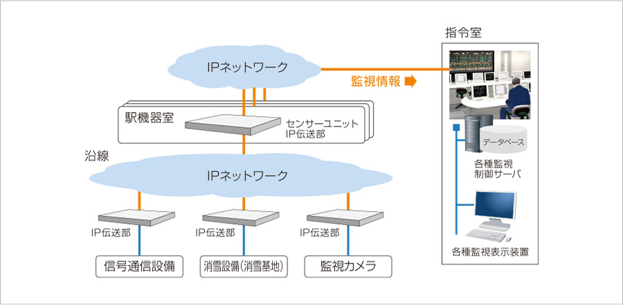 信号通信設備・風速計・雨量計など沿線に配置された各種センサーの情報を指令室でリアルタイムにチェック。 超高感度カメラ等の最新デバイスと画像解析による検知技術を組合せ、高度化するセキュリティーニーズにもお応えします。