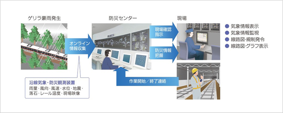 沿線気象情報のオンライン収集、情報のデータベース化し、駅務員、保守員との現場確認指示や運行規制対応など迅速かつ的確な業務支援を実現します。