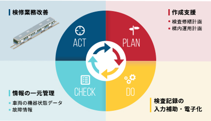 検査修繕計画や構内運用計画の作成支援、検査記録の入力補助や電子化を行います。車両の機器状態データ、定期検査等の検修データ、故障情報を一元管理し、お客様の検修業務改善をサポートします。