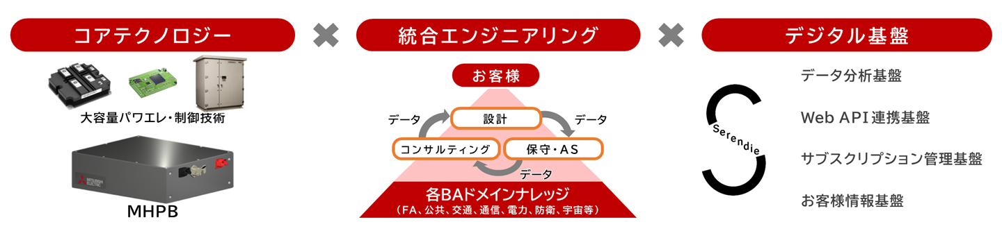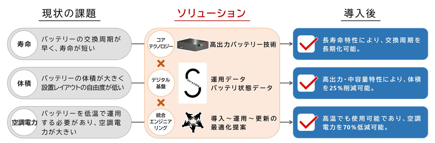バッテリーを中心としたコアテクノロジーとライフサイクル全体を支援する統合エンジニアリングを、当社独自のデジタル基盤(Serendie)を通じて融合することにより、お客様のエネルギー課題や潜在ニーズ・シーズを解決するバッテリー&エネルギーソリューションを提供いたします。