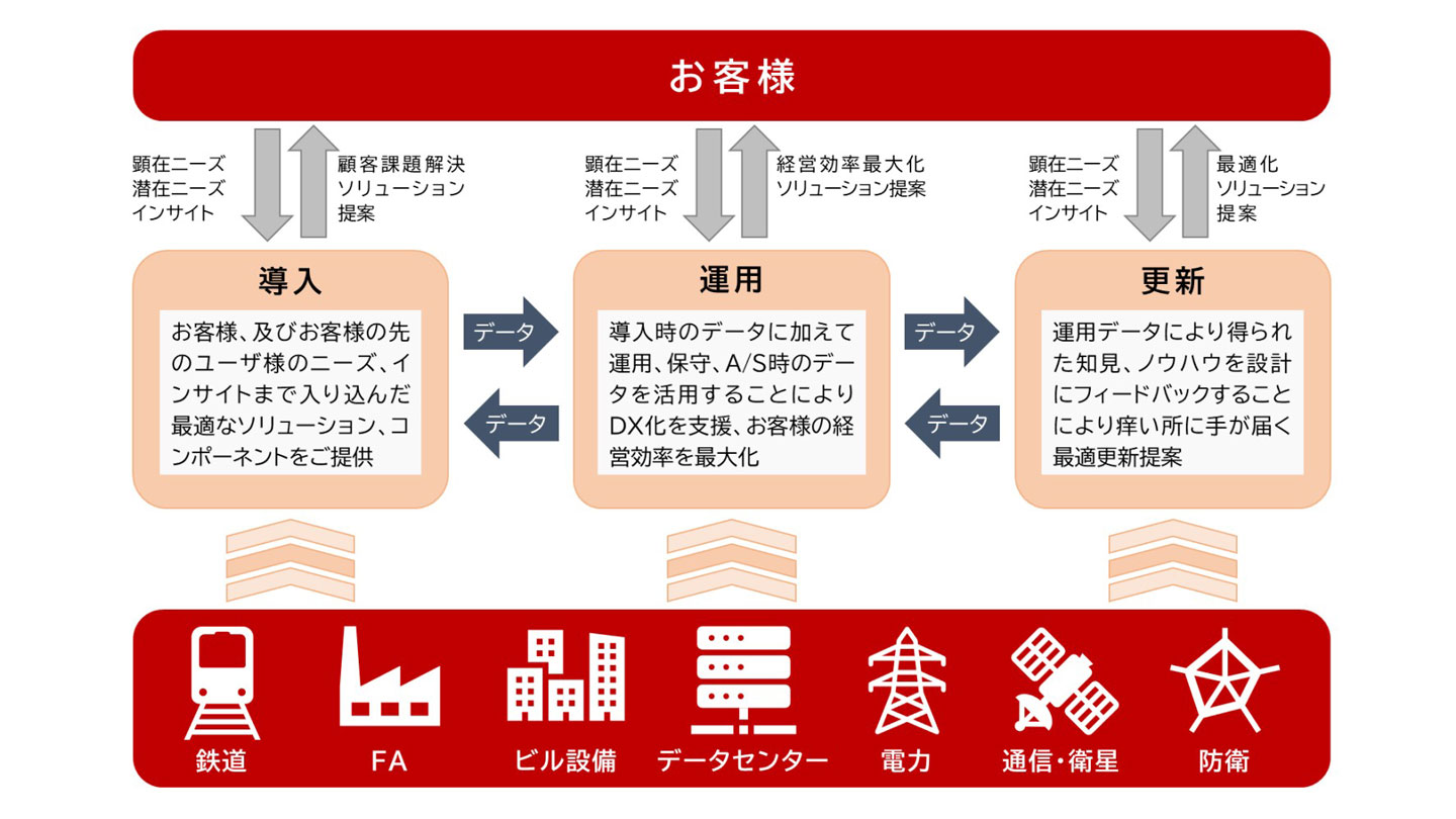 当社の各分野での技術を基に、製品・システムの導入、運用・保守・アフターサービス、システム更新をトータルでサポートし、各ライフサイクルフェーズのデータを活用することで、お客様の持続的価値向上に貢献する統合エンジニアリングを実現いたします。
