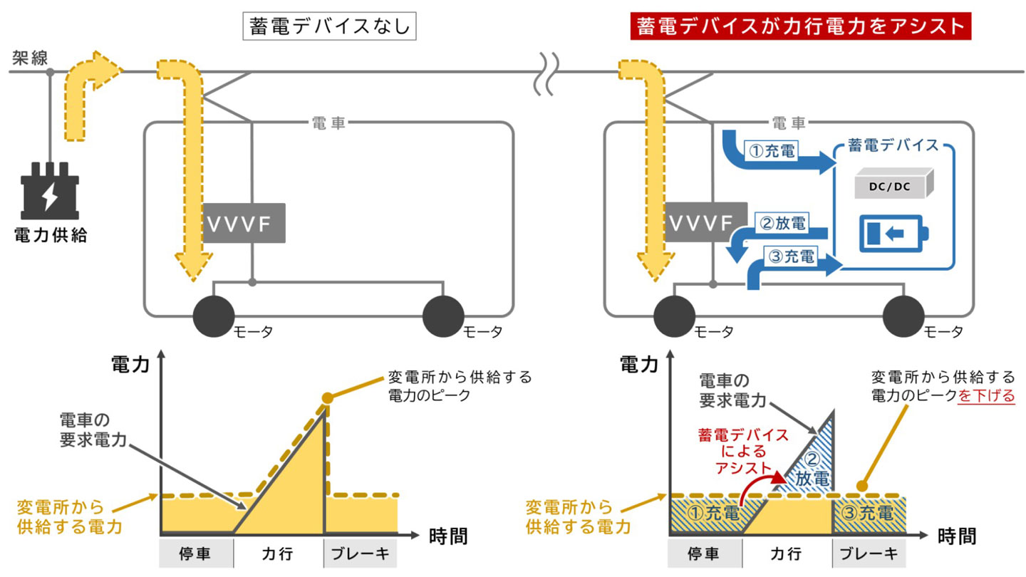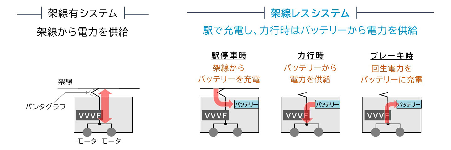 鉄道車両にバッテリーを設置し、力行時にはバッテリーから電力を供給、ブレーキ時には回生電力をバッテリーに充電することで、架線レス走行を実現できます。