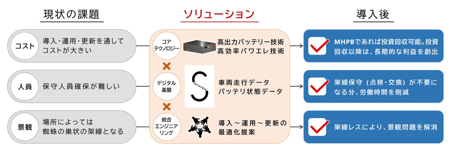 ソリューションを以下に示します。架線レストラムだけではなく、水素燃料電池等とMHPBモジュールを組み合わせるようなハイブリッドシステムにも適用可能です。