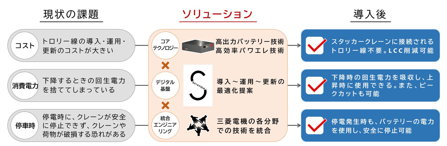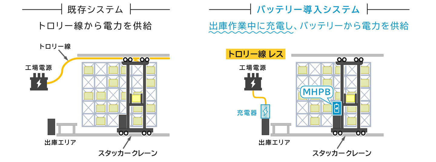 スタッカークレーンは、物流倉庫などで荷物の出し入れを行うために、上下および左右に移動しながら動作します。現在、多くのシステムではトロリー線を用いているが、新たにバッテリーを導入することで、トロリー線の撤去が可能となります。また、下降時の運動エネルギーをバッテリーに回収することで、エネルギー効率の向上が期待できます。