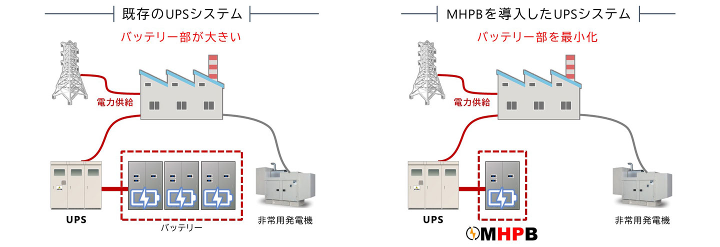 UPSは、停電発生時にバッテリーから電力を供給し、システムの継続運転を支援します。MHPBは非常用電源としての役割に加え、通常運転時のピークカット用途にも活用可能です。その高い充放電耐久性により、バッテリー部の最小化を実現します。また、高温環境下でも継続使用できる特性を活かし、弊社試算ではUPS室の空調電力を70%削減可能です。