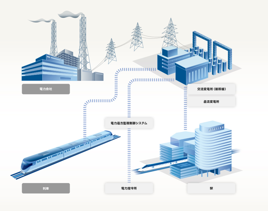 各変電所の変電設備および変電所から列車や駅舎への電力供給系統を指令所で監視制御。安定した電力供給・列車運行を支えます。