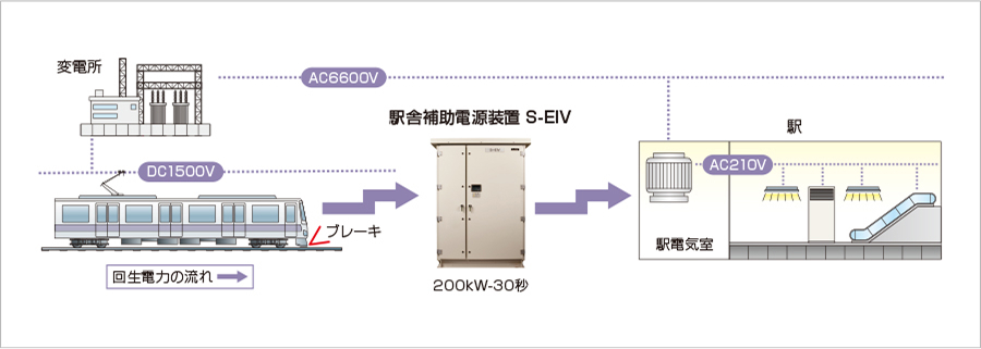 電車がブレーキをかけた時に発生する回生エネルギーの余剰分を、駅舎の電気設備へ供給します。