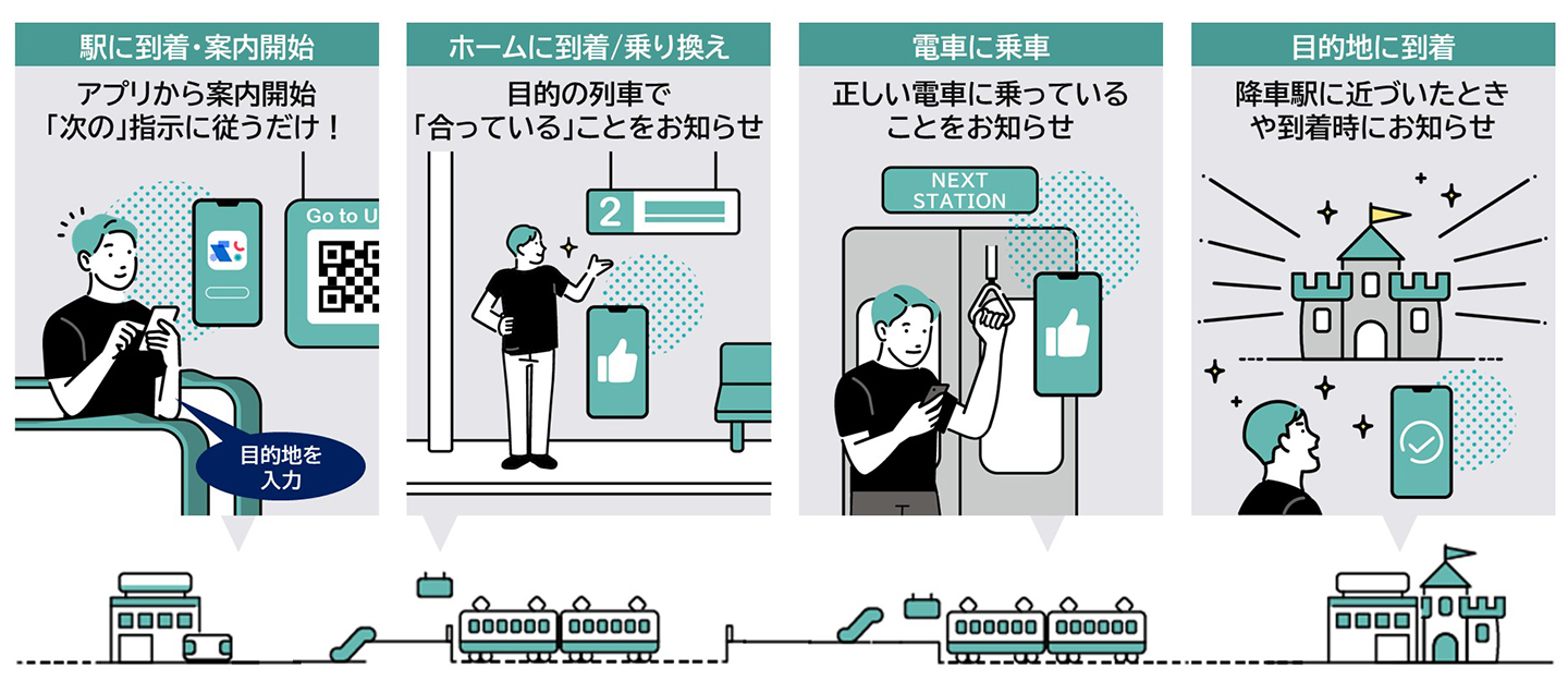 経路案内と実際の行動が合っているかをリアルタイムに判定・お知らせすることで、不安感のない、目的地までの移動を支援するソリューション