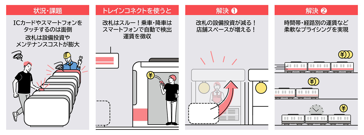 従来の改札に代えて、 列車への”乗車”と”降車”で運賃を徴収することで、改札のない通り抜け自由な駅構内を実現。新たな運賃形態や駅ナカ施設の開発・利用を変えるソリューション