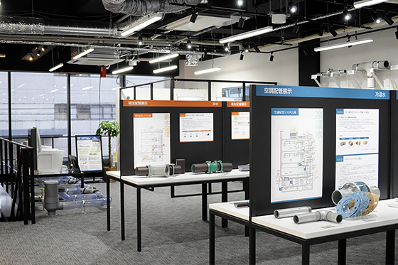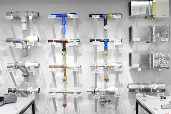 ワッツ・ラボ オオサカSANKO研修センターでは、設備工事で用いる配管を使ったアート作品やBEMSで収集したデータを確認できる大型ディスプレイを外からも目にとまりやすい位置に配置。一般の方にも、省エネに対する姿勢や実績を知ってもらうためだ。