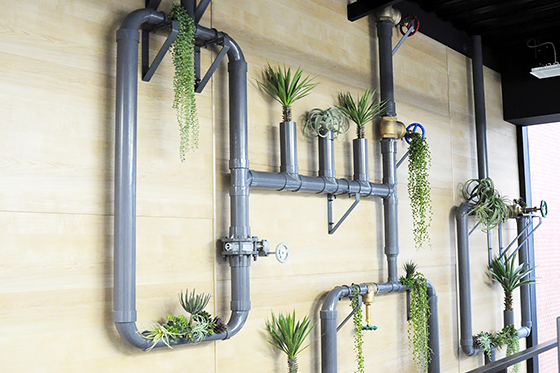 「ワッツ・ラボ オオサカSANKO研修センター」のシンボルとなっている環境問題に対する配管技術の役割を表現した配管アート